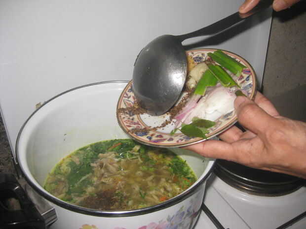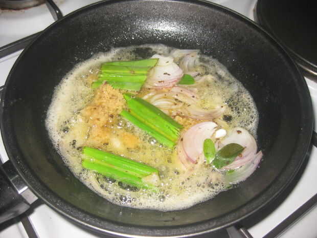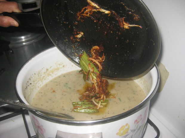 Revenido * Añadir el jengibre, ajo, cebolla, Rampe y hojas de curry en aceite o ghee. Calentar hasta su dorado Vierta a la papilla de sémola y mezclar.