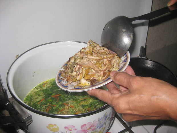 * Mediante el uso de los dedos, cortar pedazos de pollo.