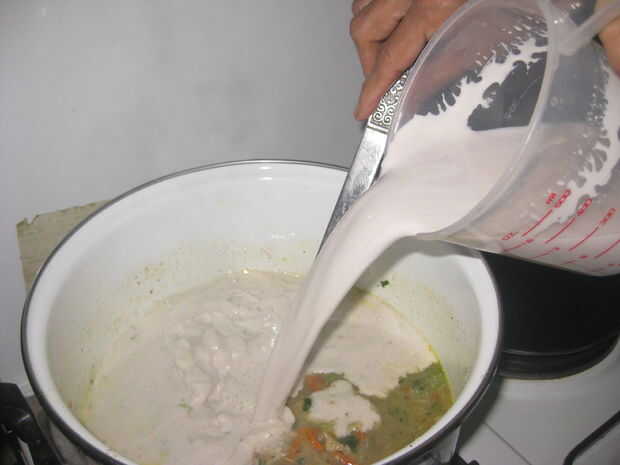 * Añadir la sémola y leche de coco. Seguir revolviendo durante 3 a 5 minutos
