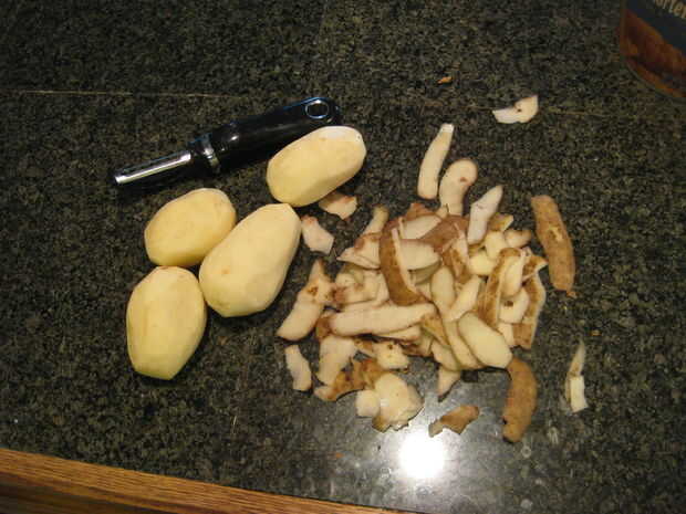 Eso es correctos! Pelar cosas marrones! 4 patatas pequeñas hará aproximadamente 3 tazas de chips terminados hervidor