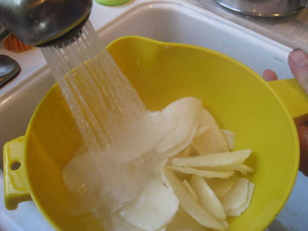Después de lavado, inserte las rebanadas de hervidor de agua. TENGA CUIDADO DE NO QUEMARSE. El aceite está caliente!!. Las patatas se burbuja y ocasionará aceite a ser salpicado si usted cae demasiado.