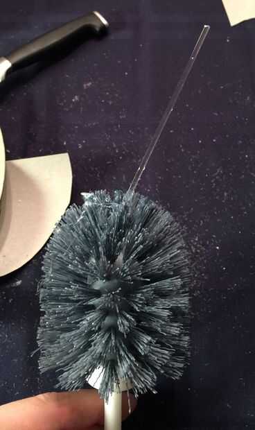 Usé mis tijeras para cortar la longitud del plástico titular apenas más corta que la longitud del cono. Era fácil de empujar el plástico duro a través de la espuma y deslizar el cono hacia la escobilla. Una vez tenía todo alineado quita el cono, agregué pegamento caliente y poner en lugar como esperé el pegamento se endurezca. He añadido más pegamento en capas para reforzar el cono.