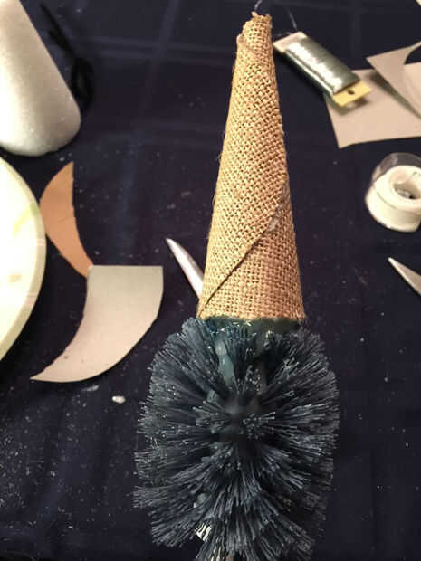 Ahora para la parte más difícil, que tenía un gran cuerno de unicornio mirando pero ¿cómo colocar un cono de papel/de la espuma a las cerdas de un cepillo de inodoro? He probado usando pegamento caliente solamente y no tiene superficie suficiente para enlazar los dos juntos. Yo sabía que necesitaba algún tipo de estructura de soporte. Aquí es donde vienen los titulares de tarjeta Floral!