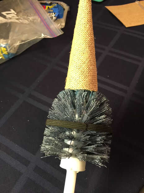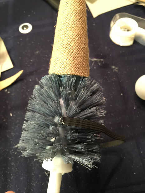 El primer paso fue pegar el elástico en el lugar alrededor de la circunferencia del cepillo. Me encontré con una fila de cerdas que se alinearon y lentamente y con cuidado caliente pegado elástico a cada uno, esperada que se enfríe y luego pasar a la siguiente. Esto no fue muy difícil pero tarda unos minutos.