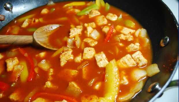 Caliente el aceite en la caldera pesada grande o en horno danés hasta medio caliente, agregue las cebollas y cocine hasta que transparente y dorado, no te quemes. Añadir el pollo, pimiento, sal y pimienta, pimentón, ají opcional escamas y caldo de pollo. Reducir el fuego, tapar y cocinar hasta que el pollo es horquilla blanda (unos 35-40 minutos).
