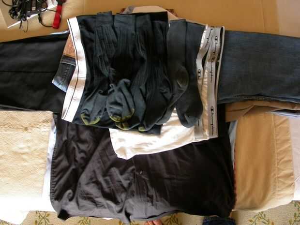 Con todos sus pantalones y camisas en su lugar, extienda su ropa interior agradable y plana en la pila. También, un par de calcetines y pone apartamento al lado del otro encima de la ropa interior. La idea es hacer una pila de ropa casi de hombro a hombro a medio torso de la camisa primera plano dispuestos hacia fuera.