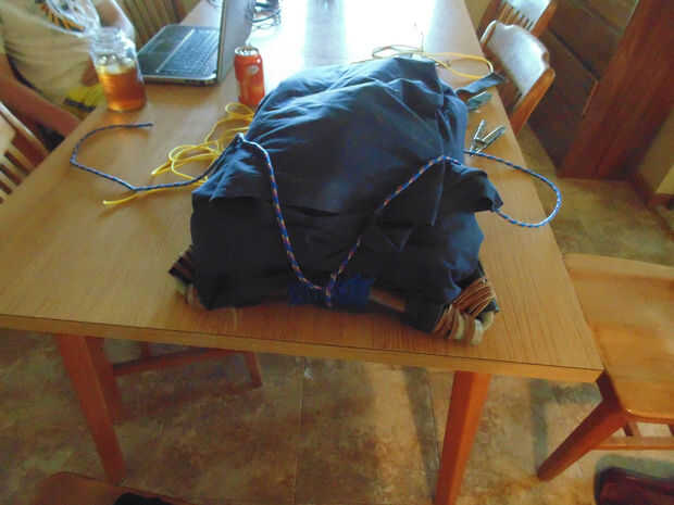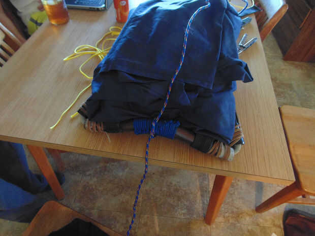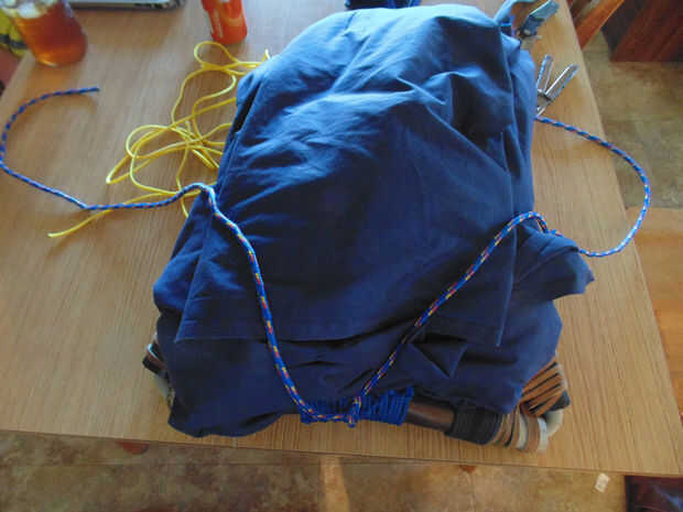 Coloque dos correas de lona en la parte inferior de la mochila (cualquier correa será trabajo.) y poner tu paquete en la parte superior. Coge una de las cuerdas de la hamaca y atar al centro de la sección del mango de su marco. mover la cuerda hacia arriba en diagonal y envuélvalo alrededor de los lados del marco sobre a medio camino para arriba. Tirar por detrás y cruzar las cuerdas. Tire de las cuerdas en la parte superior del cuadro donde se cruzan los siyahs. Cruzar las cuerdas otra vez y envuélvalos alrededor de los siyahs. Atar con un nudo.