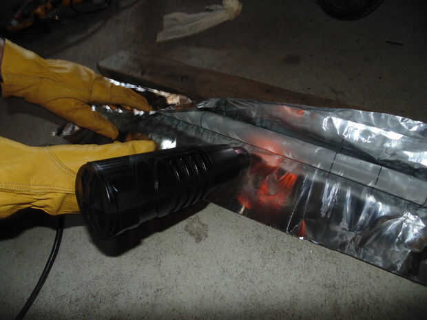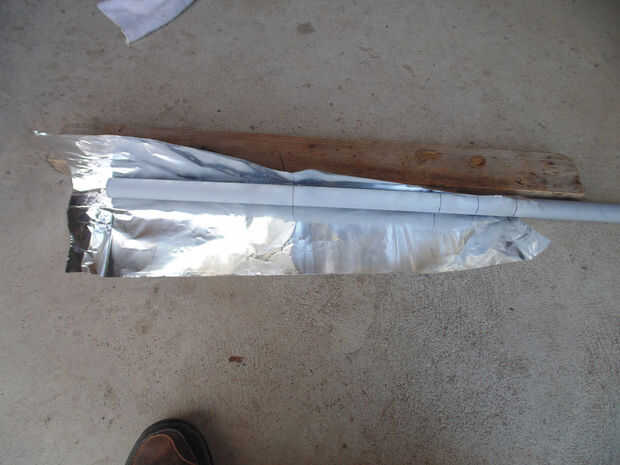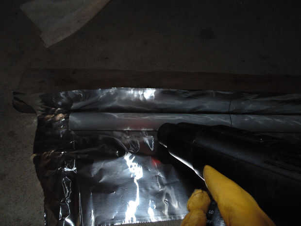 PVC se refresca apagado mucho más rápido de lo que es conveniente. Quiero secciones de 1 pie de calor a la vez (por lo tanto las marcas extras que hice) y doble el papel de aluminio extra encima de ellos para mantener el calor mientras trabajo en otra sección.