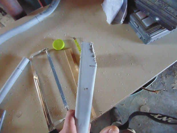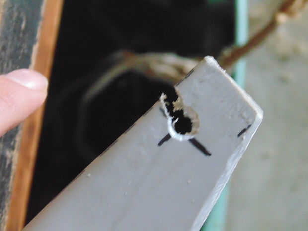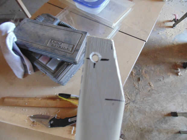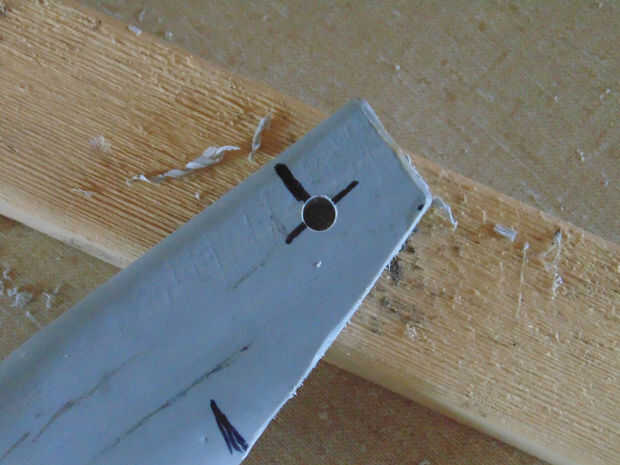 A continuación añadimos los nocks de cadena por agujero de 3/16 pulg en la punta de perforación (en el espíritu del Apocalipsis perforé el agujero a mano). Hice mi 1/2 pulgadas desde la parte superior y 3/8 de pulgada de la parte delantera. Luego tomar una sierra y cortar el agujero en ángulo. Afeitarse los bordes afilados de los cortes y perfore el agujero con un cuchillo o un archivo que no cortaron la cuerda cuando usted la secuencia.