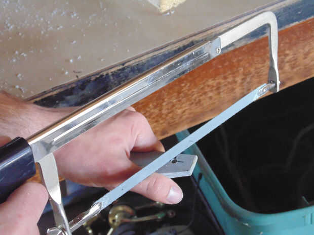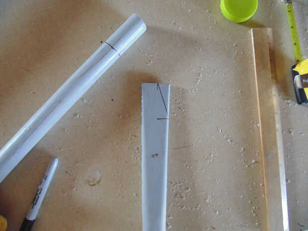 Medida 3/4 pulgadas desde el lado de la siyah y 1 3/4 pulgadas desde la parte superior. Dibujar una línea entre las dos marcas y corte a lo largo de la línea.
