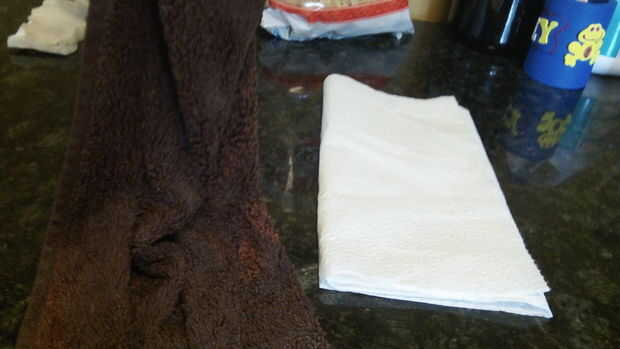 Ponen su toalla sobre la toalla de papel. Toalla del doblez de su paño en la forma de la toalla de papel, por lo que es un poco más grande que él... Empuje firmemente hacia abajo en la toalla para que el agua empapa en la toalla de papel.
