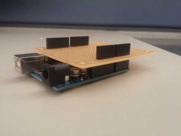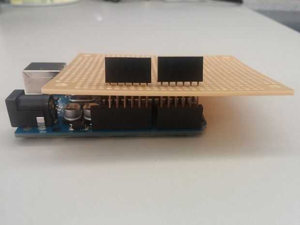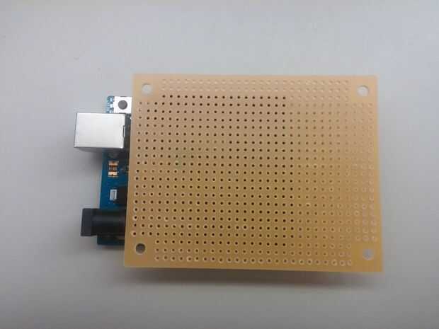 1. Colocar la placa perforada que vino con el escudo de Adafruit DIY en el Arduino. Coloque la Junta perf cómo quieres que el producto final esté alineado.