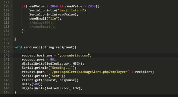 void sendEmail(String recipient) << aquí nos en contacto con el PHP script funcionando y pase el nombre del empleado que botón ha sido empujado. Además, antes de enviar el correo electrónico, me prende el indicador LED para saber el usuario que el mensaje fue recibido correctamente, entonces hace una pausa para que usted no puede enviar varios mensajes a la vez. Después del retardo, el LED se apaga otra vez.