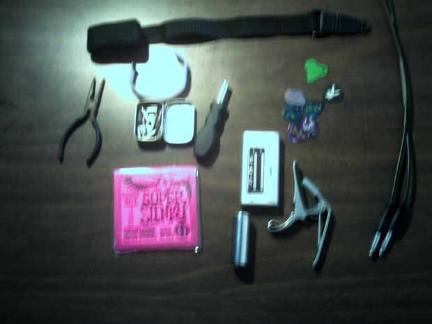 este es mi kit de supervivencia de la guitarra. Aquí es algunas cosas están muy bien para tener con usted si tocas la guitarra eléctrica.En el kit encontrarás:-Un adoptante-Un sintonizador de-Una selección del pulgar-selecciones 3 normalSi tienes una