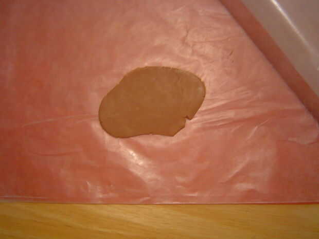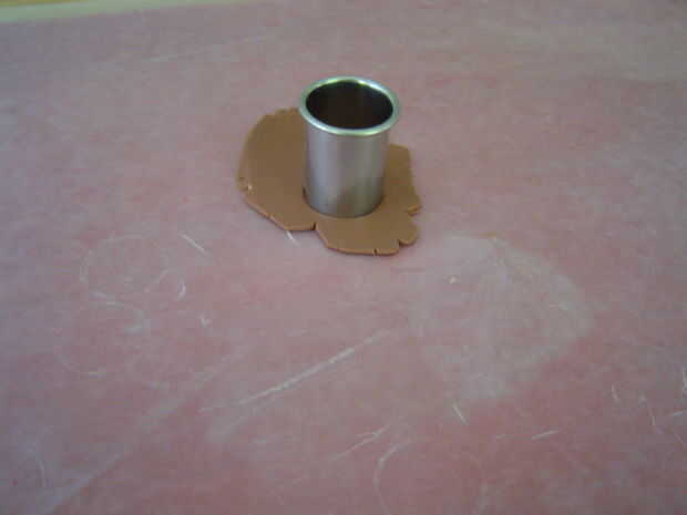 La primera parte es para hacer los bollos de hamburguesa. Para hacer el pan se necesita luz marrón arcilla. Instrucciones para hacer que la arcilla marrón clara es en el color de mezcla manual en el paso uno. Empezaremos con el bollo de fondo. Extienda la arcilla hasta que se trata de 1/8 de pulgada de grosor. Utilice un cortador de galletas pequeño, del tamaño de la imagen de abajo, para recortar un pequeño círculo de color marrón claro. Y tienes un bollo de hamburguesa!