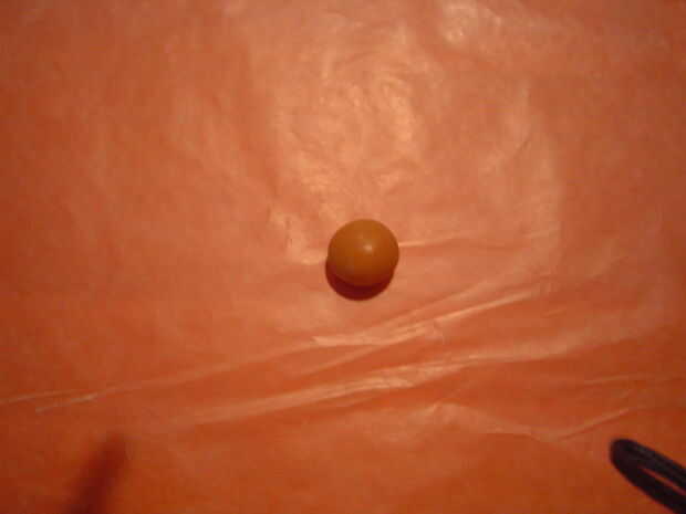 y ahora el pan de hamburguesa superior! Rodar una bola de arcilla marrón claro el tamaño del moño de fondo. Cortar la bola de arcilla por la mitad y tienes el pan de hamburguesa superior! Si te gusta las semillas de sésamo, utilice un palillo de dientes para meter pequeños agujeros en la parte superior.