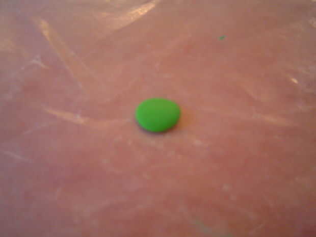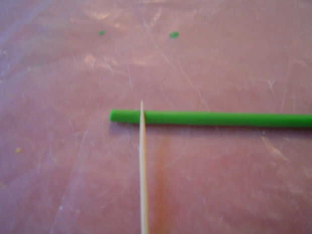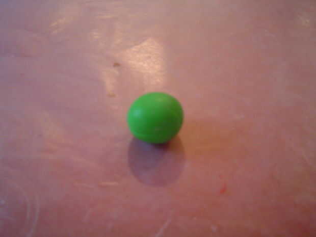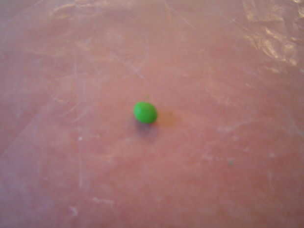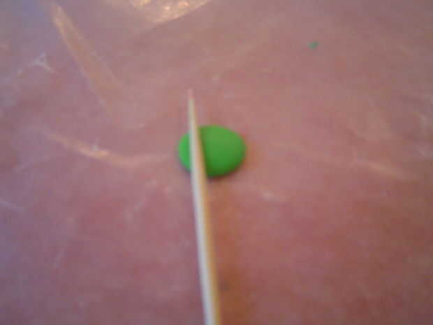 No te en una salmuera haciendo estos encurtidos. Rollo de una bobina de barro amarillo/verde y usar un palillo de dientes para cortar una pequeña porción de la bobina como en las siguientes imágenes. Usted puede encontrar las instrucciones para la mezcla de barro amarillo/verde en la guía de color en el primer paso. Rollo de la pieza de arcilla en forma de bola. Utilice el pulgar para presionar y aplanar la bola de arcilla. Detalles con palillo de dientes otra vez! Usando el palillo de dientes, pulsa al lado de abolladuras en la salmuera hasta que ambos lados están cubiertos en las abolladuras. Tienes un pepinillo!