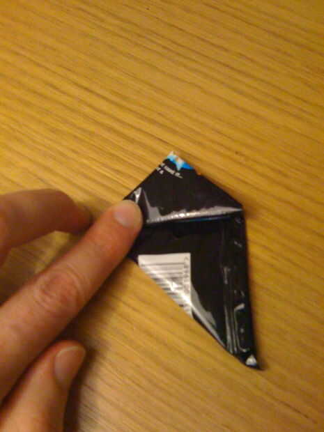 Doblar la esquina superior izquierda hasta el borde de la mano derecha para crear un triángulo grueso en la parte superior del paquete.