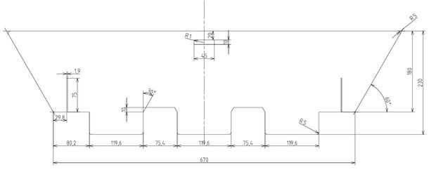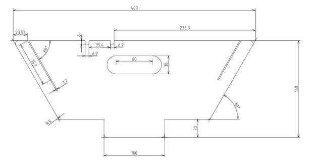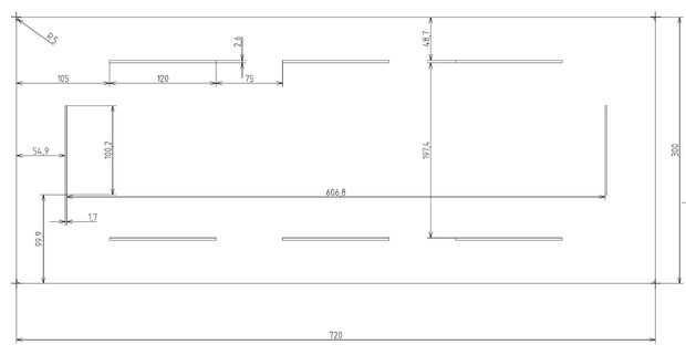 Mi parrilla de cocción es de 60cm de largo y 20cm de ancho (60 x 20). Utilizar estas mediciones para crear mi placa horizontal. Como se puede ver en la imagen, la distancia entre los cortes son alrededor de 600mm y 200mm. Tengo estas medidas correcta dibujando todo en computadora.