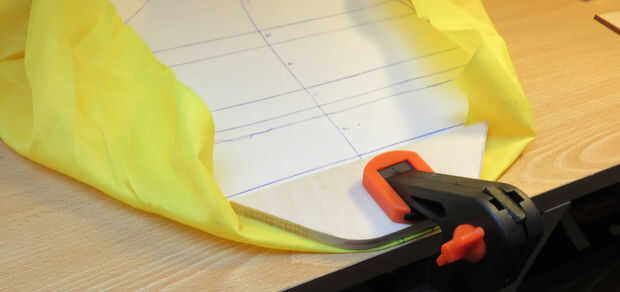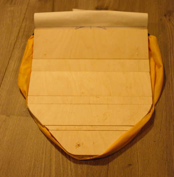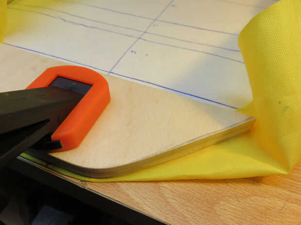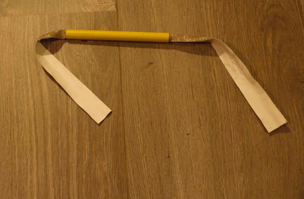 Pegamento de la tela exterior entre la madera y el mantel. Ambos extremos del mango es necesario encolar entre así. Utilizar suficiente pegamento, pero asegúrese de que el resto de la tela de no conseguir pegado juntos. También los lados de la madera contrachapada deben estar libre de pegamento!