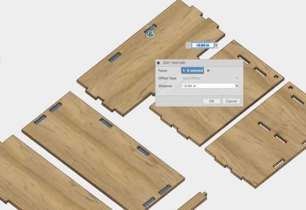 Una última modificación para la fabricación. Los bolsillos ciegos actualmente están modelados exactamente al ras a los extremos de las lengüetas de ciegos. Deberíamos añadir más espacio libre.