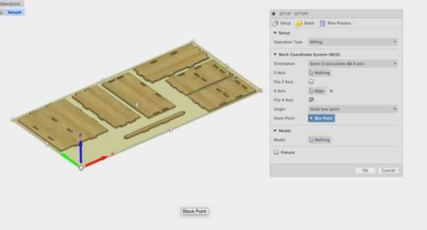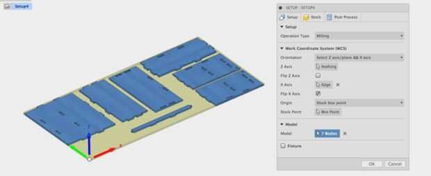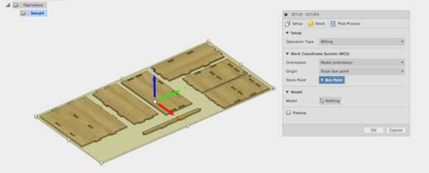 Lo primero que hacemos en CAM es crear un "Setup". Esta es una colección de operaciones. Cuando se utiliza un router CNC (con un cambiador de la herramienta) me gustaria hacer una configuración para cada herramienta se utilizará. En este caso es solo una sola compresión plana fresa.