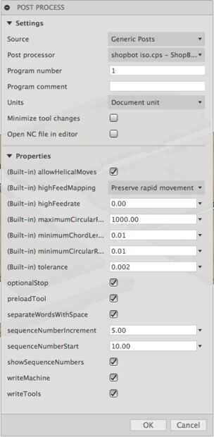 Seleccione el puesto de "shopbot iso.cps" crear código genérico g o el "shopbot.cps" para generar el código abierto de SBP.