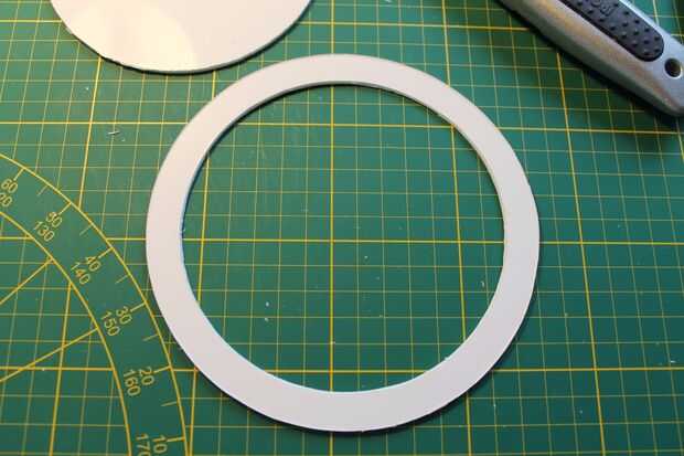 En la hoja de los PP con espesor de 2mm, corta el anillo. El anillo tiene un diámetro exterior de 156mm e interior 126 mm de diámetro.