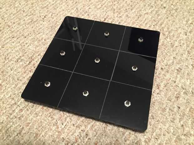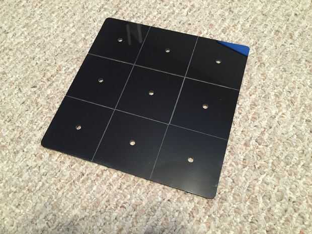 La parte superior del juego se hace de 1/8" negro acrílico. La parte superior de acrílico negro es que parece fantástica cuando limpio pero recoge polvo como un loco. El otro gran beneficio y razón por qué elegí negro es que es totalmente opaco en 1/8" de espesor. Quería que el LED de la superficie de juego debe esconderse hasta que encienda para arriba. Es por eso mecanizan el. 070" bolsas profundas (tiene que ser muy fino para dejar la luz a través). Cada cuadro de juego tendrá 4 LEDs RGB que se iluminará de azul para el jugador 1, rojo para el ordenador, y destellos verdes indican una orientación ganador. El agujero en el centro de cada cuadrado del juego es para el botón. Originalmente quería tener los botones ocultos bajo la superficie, así y uso táctil pero la proximidad a otras plazas y la tendencia para los dedos para cepillarse demasiado cerca de la Plaza mal hecha práctico.