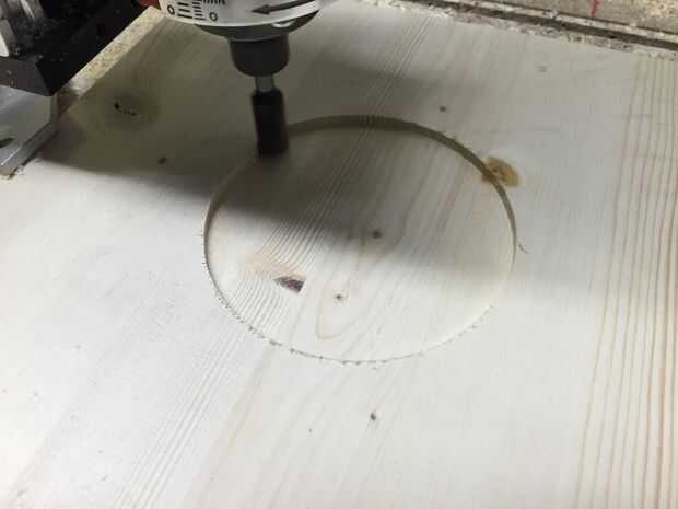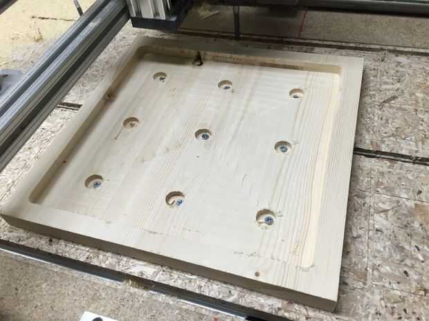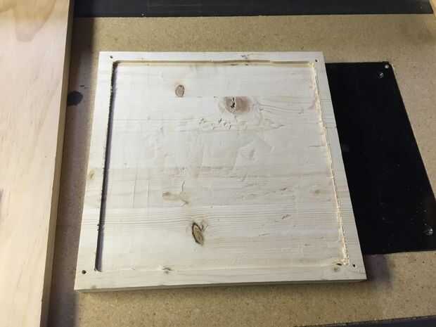 Con el fin de incluir el cableado que hacer en el siguiente paso necesitarás una base. Hice uno cortando un trozo un poco más grande de 3/4" Aspen Pine (10,125" X 10,125") y vaciar un bolsillo profundo 1/8" para los circuitos y los alambres para sentarse. Hueco hacia fuera usando un router de diámetro de 1/2" broca y placas de sujeción a la tabla para limitar viajan. A mi me funciono muy bien. Podría haber también escrito un programa de router CNC pero no era necesario.