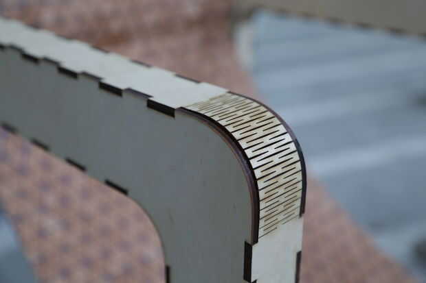 Quería que mi silla para ser diferente de otros láser paquete plano muebles. La mayoría de los muebles existentes de paquete plano rígida y sólo utiliza piezas planas de madera. Decidí explorar usando madera textiles para crear una estética más suave. (Aplicación de madera en el asiento es opcional y no sirve a ningún propósito funcional, solo me gustaba lo veía y se comportó cuando se sentó!) ¿Creo que este interesante material ofrece cierto potencial emocionante de diseños de muebles futuro... hamaca de madera?