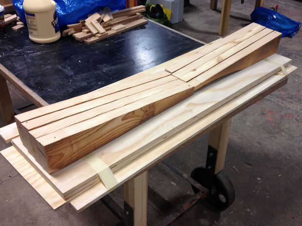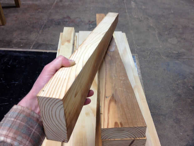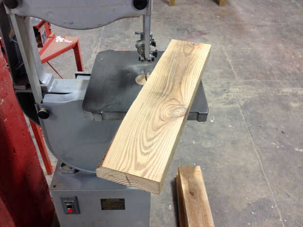 Para las patas, cortar 4' pieza de 2 x 6 en dos 24" espacios en blanco. Medir en 1-1/2" de una esquina en el final del espacio en blanco y haga una marca; hacer lo mismo desde la esquina opuesta en el extremo opuesto. Conecte las marcas para hacer una línea diagonal que divide el espacio en blanco a lo largo. Esto te permite obtener dos patas fuera de la misma pieza de material para la eficacia máxima. Esta línea de corte (con cuidado) en la Sierra de cinta. Utilice un plano ensambladora o mano para alisar cualquier irregularidad en el corte.