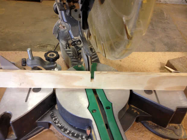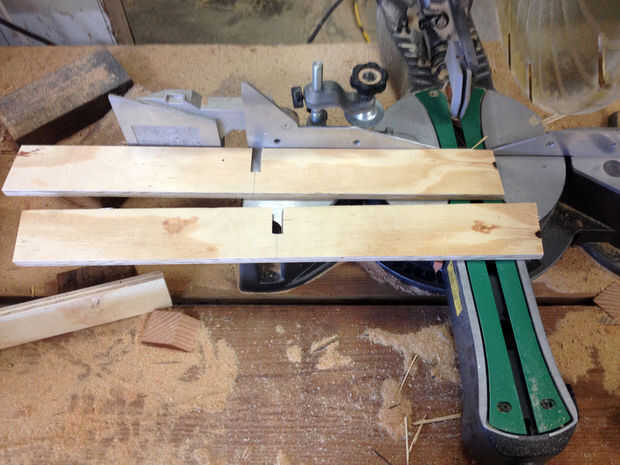 Para permitir que las piezas a la Cruz, allí debe ser una muesca en el centro de cada tira. Para lograr esto, definir el tope de profundidad en la tronzadora (generalmente un tornillo ajuste pedacito a la izquierda o la derecha de la hoja) la hoja deje de 1-1/4" por encima de la superficie de la base de la sierra. Fijar el inglete a 15 grados. Marque la línea central de cada tira. Corte una muesca de 1/2"(o sea el ancho de su material) centrado en la línea de centro dibujando la sierra hacia abajo y a través de la tira una y otra vez.