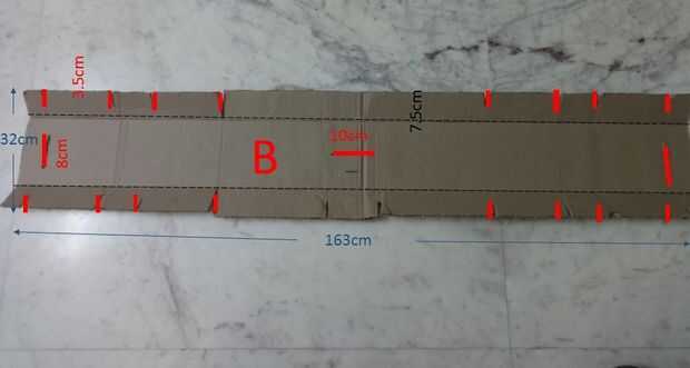 El primer paso es hacer las vigas de sección en la que el cuerpo descansa. Para hacer ese comienzo sacando las piezas '' A'', '' A1'' y '' B'' y corte las ranuras (las líneas rojas). Una vez hecho doblar la pieza donde está la línea punteada. Para hacer el cartón doble puntuación fácilmente la cartulina aplicando presión muy suave con su cuchillo x-acto. Ahora doblar donde están los requisitos. Es hora de empezar a les que se enclavija. lugar las piezas '' B'' dos paralelos entre sí y luego igualar '' A/A1 '' y '' B'' ranuras que encajan entre sí. Usted debe terminar con algo como en las fotos. Asegurarse de que '' A1'' se coloca en el extremo exterior con la solapa hacia fuera.