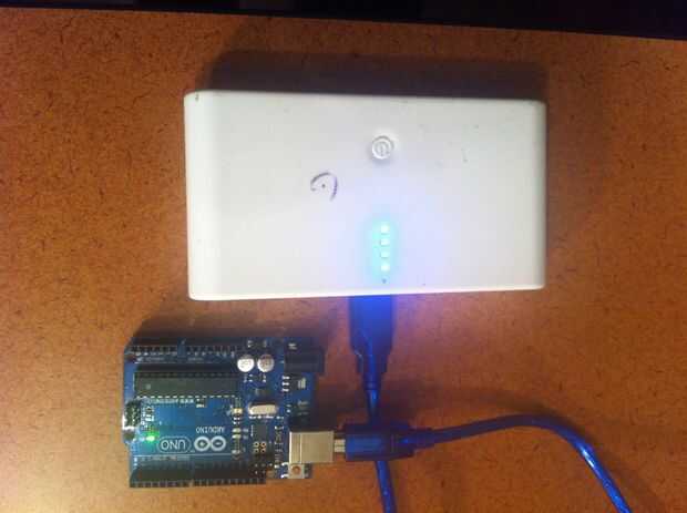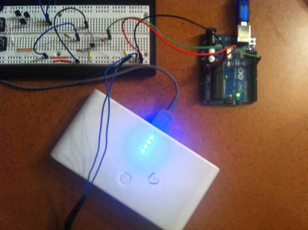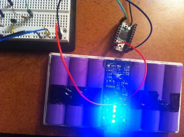 La solución es utilizar la Arduino a la energía del pulso a un transistor que descarga una gran cantidad de corriente (~ 250 mA) durante un período corto de tiempo. Encontré 50ms cada 5 segundos era suficiente para mantener la batería. Equivale a un ciclo de trabajo de 1% o 2.5ma. No grandes pero mejor que apagar cuando usted lo necesita para permanecer en.