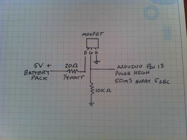 Utiliza 50ms cada 5 segundos a través de una resistencia de 20 ohm.
