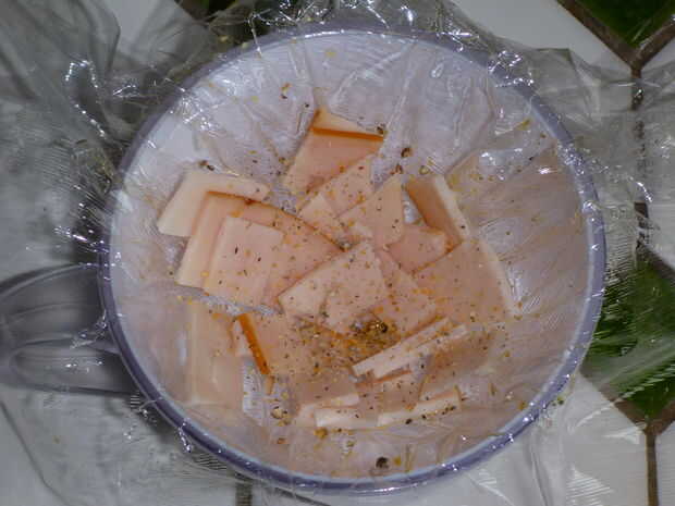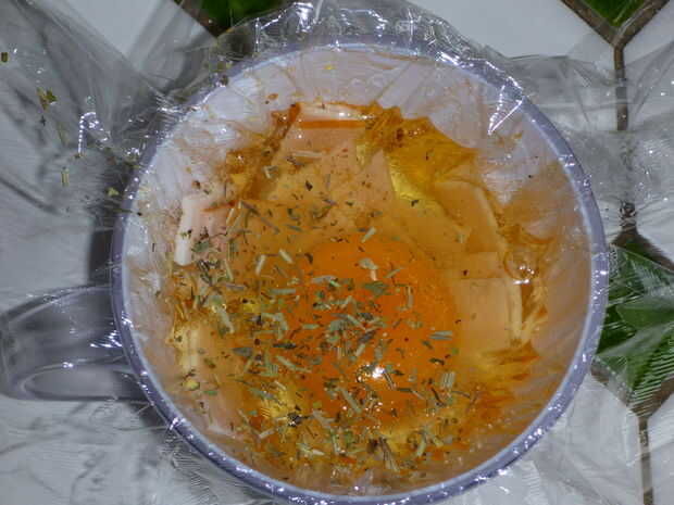 luego coloque la envoltura de plástico sobre la taza vacía y poner los ingredientes dentro. El aceite con evitar de conseguir pegado al plástico y facilitará las cosas todo mucho descomprimir.