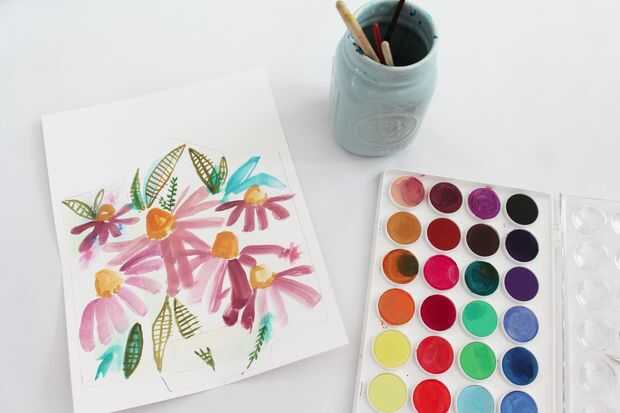 Pintar flores, hojas y patrones abstractos dentro del ámbito del trazado de la envolvente. Áspero formas de flores y hojas con un pincel mediano. Añadir detalles y dimensión con un pincel pequeño.