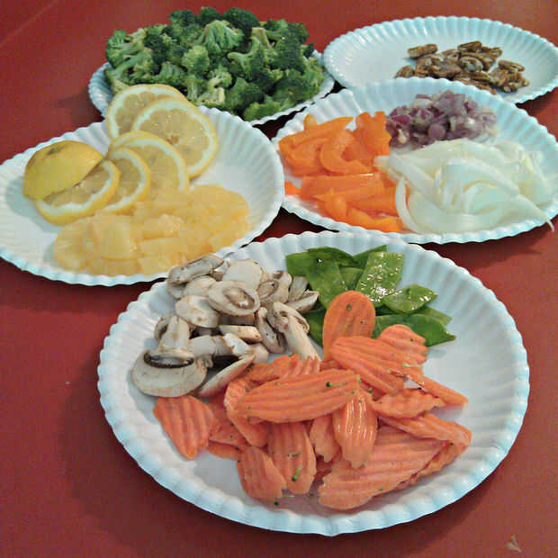 Añadir 1-2 tazas de verduras a cada paquete de papel de aluminio. Los niños deciden que odian cebollas. ¡Está bien! A no poner cebollas en sus paquetes. Abuela se carga en el brócoli, y decido ser aventurero y mezclar en un poco de todo.