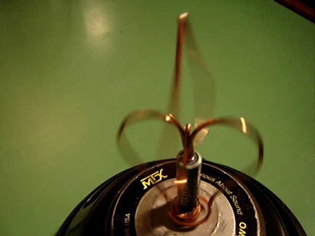 La película anterior muestra un altavoz de bajos como la fuente del campo magnético para el motor homopolar de corazón. Centavos se utilizan como un conmutador.