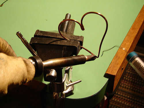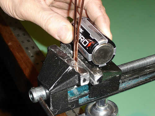 Para el corazón, los dos extremos rectos se convierten acompañados de soldadura, por lo que deben cumplir juntos. Además, la altura total del corazón debe ser la correcta (alrededor de 8,5 cm funciona bien) para que pueda sentarse en la batería, toque las monedas o conmutador de imán y no del altavoz o mesa. La distancia de la batería + terminal al imán punto de contacto debe ser alrededor de 6,0 cm.