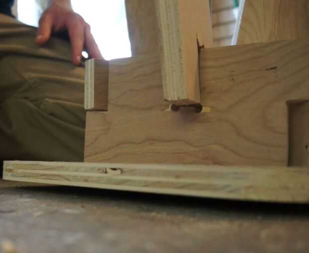 Inserte las ranuras de las patas en las ranuras en las piezas del marco. Piernas deben orientarse hacia el exterior y sus interiores consejos solo deben borrar el perno de carruaje.