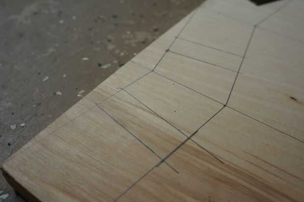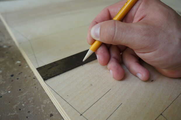 - Dibuje una línea a través de estos puntos, perpendiculares a la línea original de ángulo de 10 grados y que se cruzan la línea de ángulo de 10 grados dibujada en la marca de 2". Esto formará la ranura para la fijación al marco.