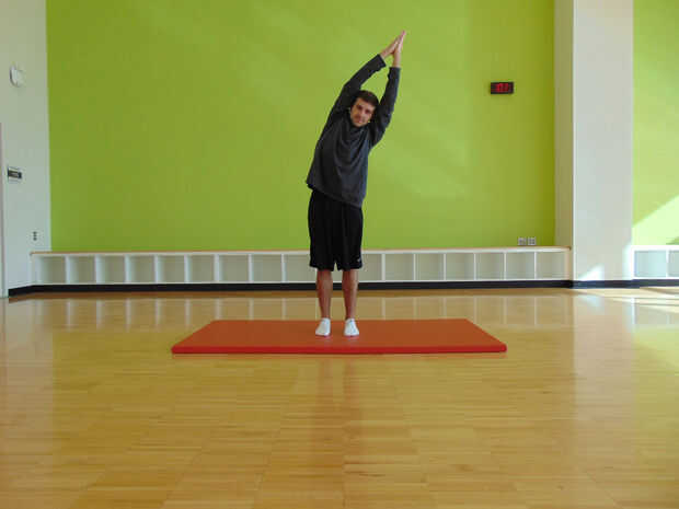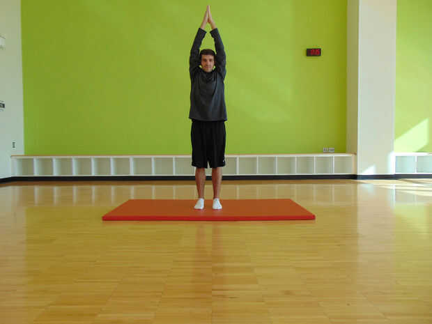 Desde la posición de partida llevar los brazos hacia arriba y sobre su cabeza, tocando tus palmas juntas. Mientras subes los brazos toman una respiración profunda que los pulmones están llenos cuando reúnes las palmas. Exhale lentamente y luego mantener la posición durante tres segundos.