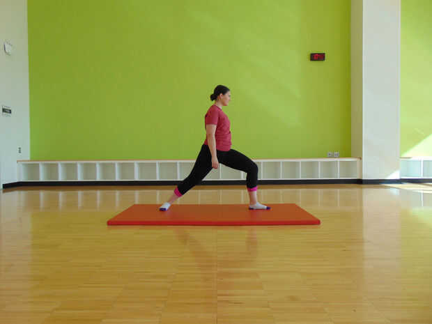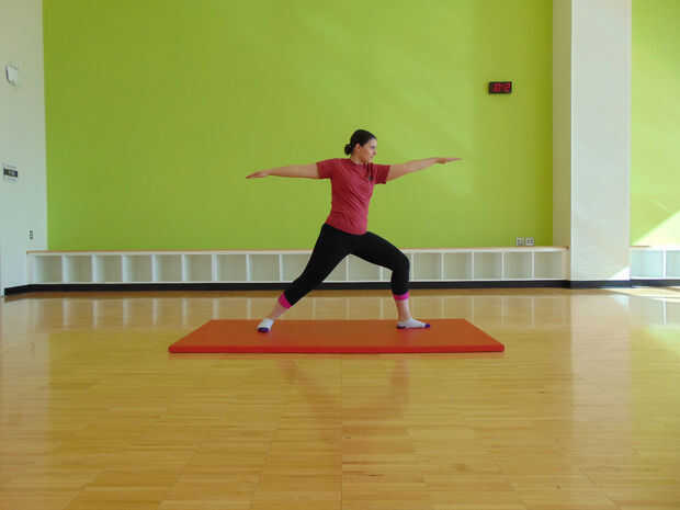 De la posición inicial separó sus piernas para que su cuerpo y su pie derecho hacia la derecha. Su pie izquierdo debe ser perpendicular a su pie derecho. Doble la pierna derecha para formar un ángulo de 90° con el suelo extendiendo sus piernas separadas como sea necesario. Mantenga esta posición durante una respiración profunda.