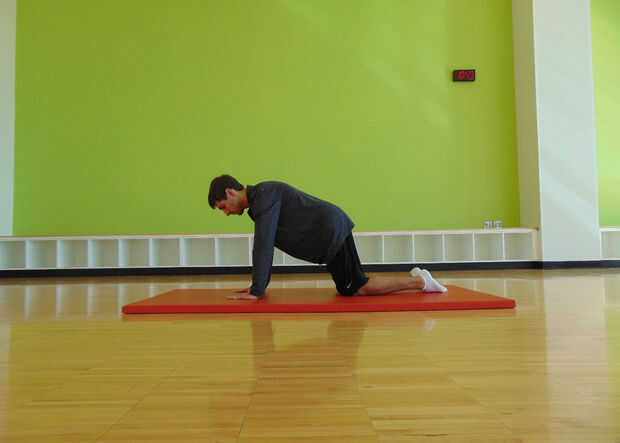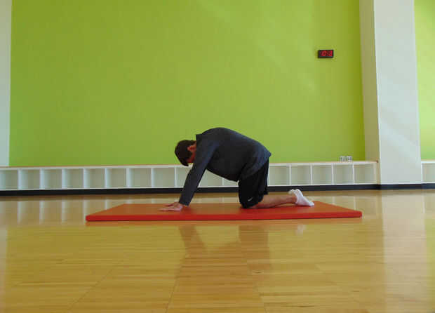 Cae de rodillas a la tierra como si vas a gatear, tanto como un gato caminando. Las manos de los brazos deben estar en línea con las piernas. Respirar durante cuatro segundos como su enrollamiento hacia atrás hacia arriba hacia el techo. Mantenga sus hombros cerca de sus oídos. Mantenga esa posición durante tres segundos.