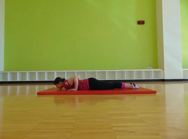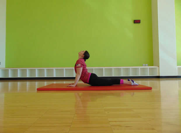 Coloca las manos en la alfombra cerca de los hombros como si fuera a hacer un pushup. Empuje hacia arriba con los brazos manteniendo las piernas en el suelo y arquear la espalda. Mantenga esta posición durante cuatro respiraciones con cada respiración separados por un conteo de tres segundos.