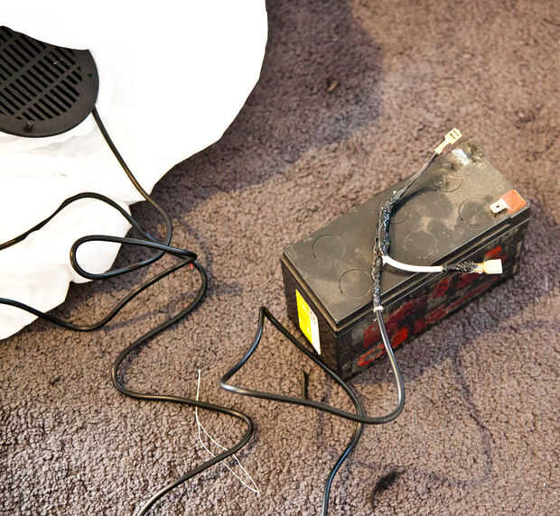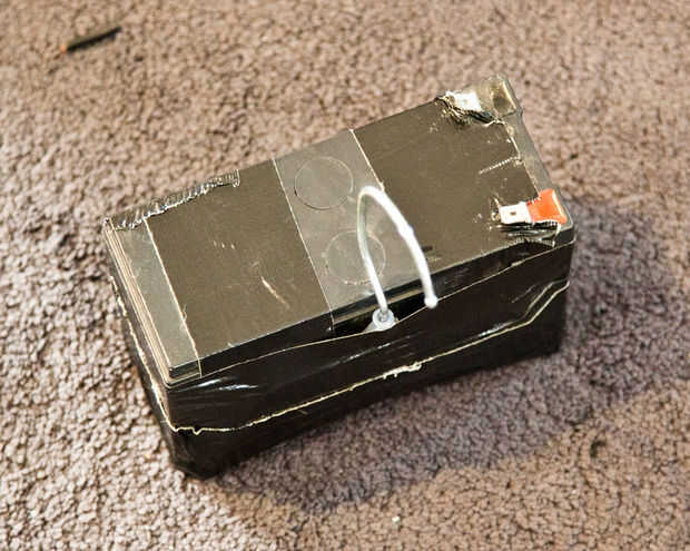 a continuación tuve que encontrar una batería de 12v que iba a durar lo suficiente para mantener este traje inflado en una fiesta. Esto fue hecha usando una vieja batería de gel de una mezcla de reserva. Así que corté el cable que iba al adaptador de pared y soldar unos conectores planos que me permita conectar a la batería. Después de probar el motor de esta nueva batería la primera cosa que noté fue cómo pesado la batería. Así que decidí hacer una salida para conectar a mi cinturón. Éste se realiza utilizando una percha de plástico (el tipo con el gancho metálico en la parte superior). Corte la suspensión hasta la duración de la batería y utiliza alguna cinta adhesiva para fijarla. He doblado la parte metálica de la suspensión a ser más estrecho y había colgada de mi cinturón. Era un poco incomodo al principio pero re había posicionado y estas diferentes maneras ya no era tan molesto.