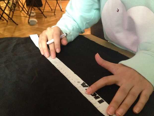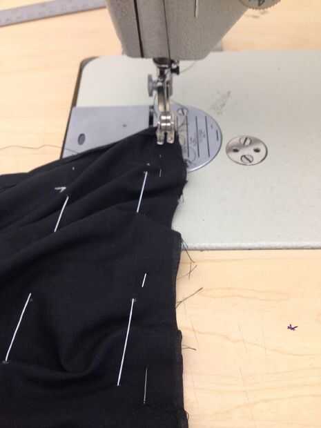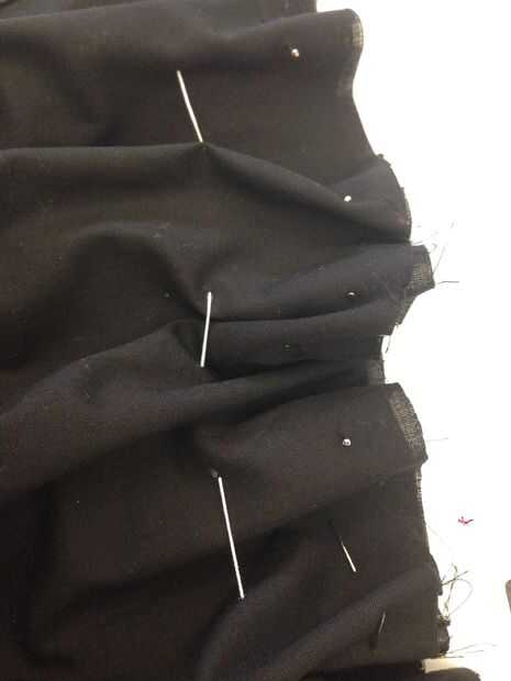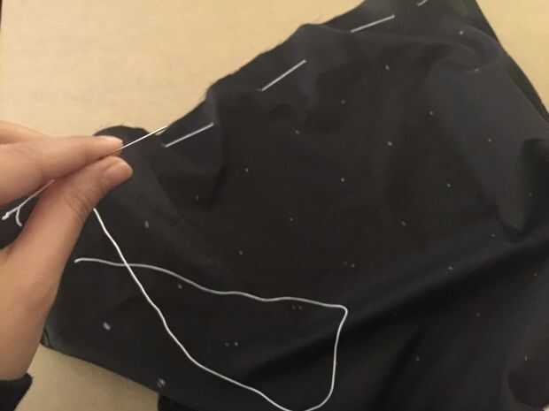Fin de las mangas que se extienden como las mangas de una camisa de fuerza, he añadido una pieza extra de tela. antes de coser las piezas de la prenda, he añadido hilo a ella. En primer lugar, dibujaba una cuadrícula en la tela así que puedo mantener la costura limpio. Mantuve 8 cm entre los puntos, entonces empecé a coser el elástico en él. Había encogido a la tela en el elástico y luego cerré la manga utilizando la máquina de coser. Después de eso, he añadido la manga a la ropa