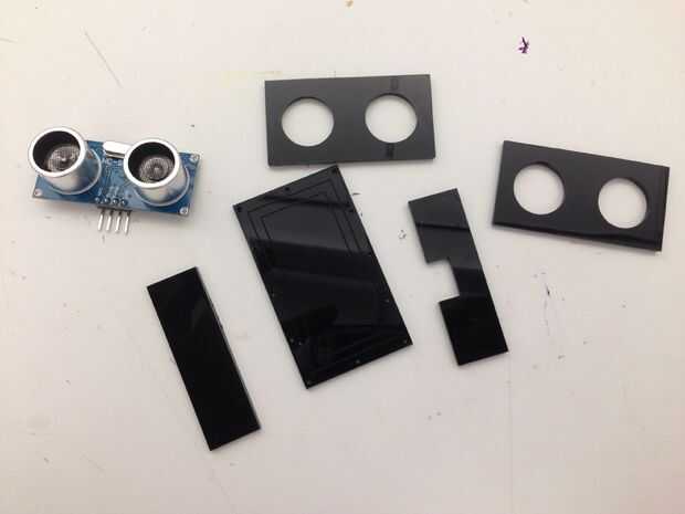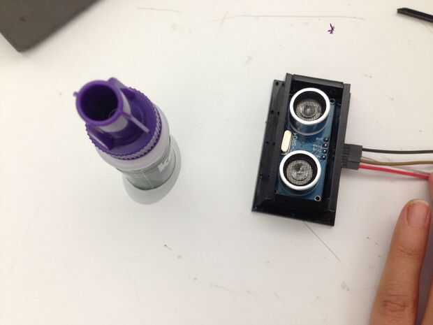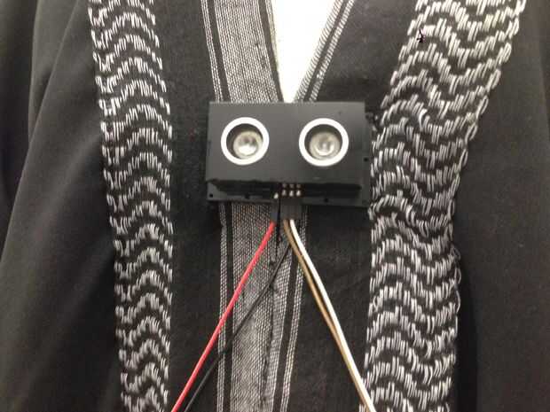 También construí una caja para el sensor de ultrasonidos que se añade a la prenda. Soldado los cables para hacerlos más largos por lo que puede ser conectados al arduino y protoboard en la parte posterior.